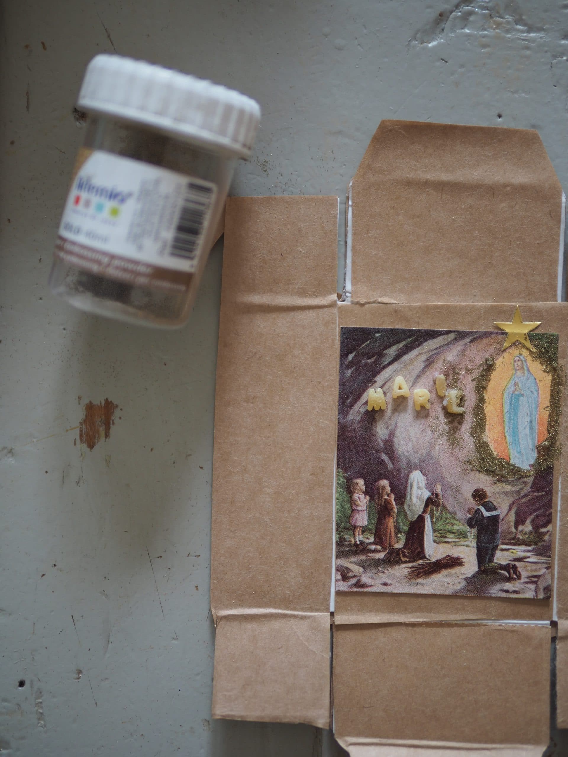 Pour ce brico il te faut une boite d’allumette, du papier kraft (ou des sachets de fruits et légumes…), de la colle, une image de Marie et des petites gommettes ou autres…