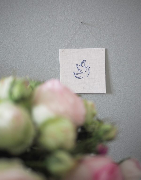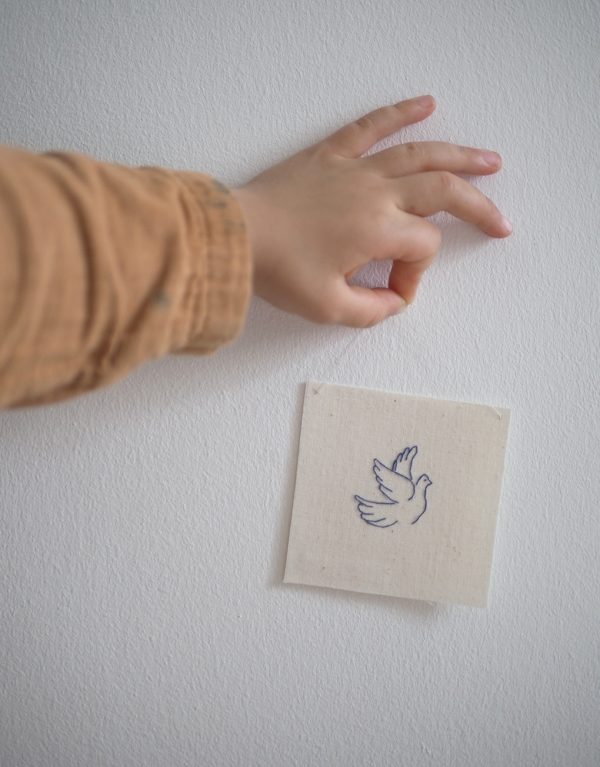 Broderie moderne et minimaliste d’une jolie colombe. On aime le dessin brodé à la main par la créatrice au fil bleu marine.